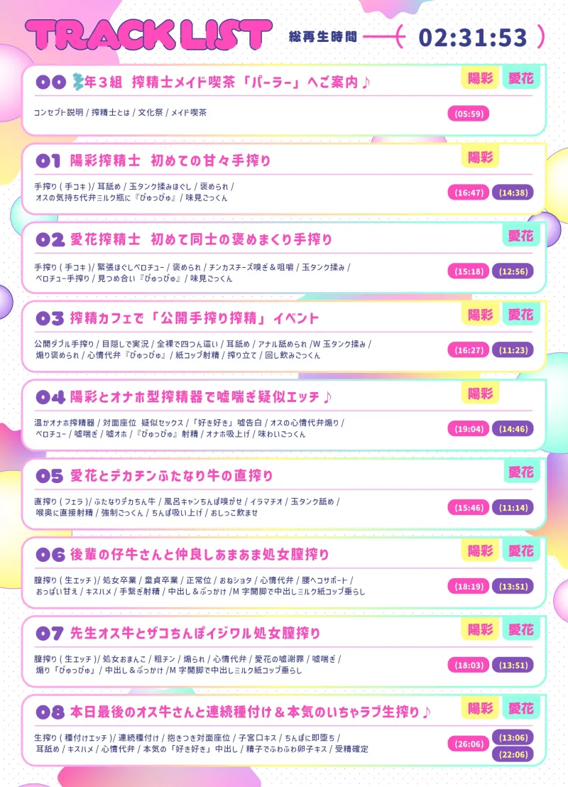 【手搾り(手コキ)/耳舐め/玉タンク揉みほぐし/褒められ/オスの気持ち代弁/ミルク瓶に『ぴゅっぴゅ』/味見ごっくん】