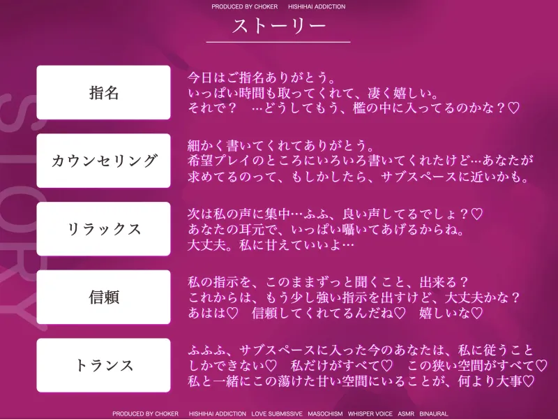 SMプレイ中にマゾが入る特殊なトランス状態「サブスペース」を味わうことができる音声です。