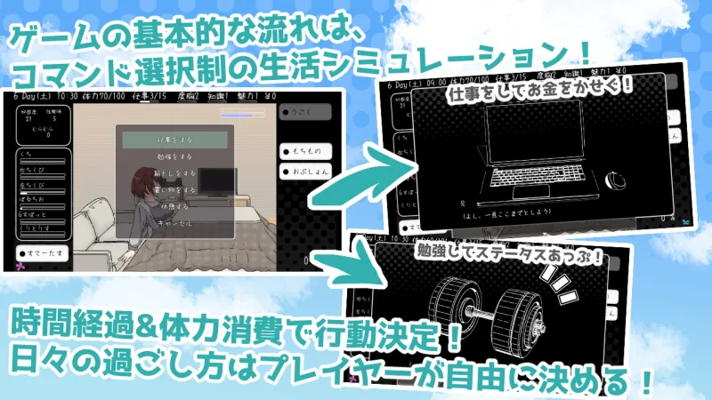 (2)ゲーム基本的な流れはコマンド選択制の生活シミュレーションです。