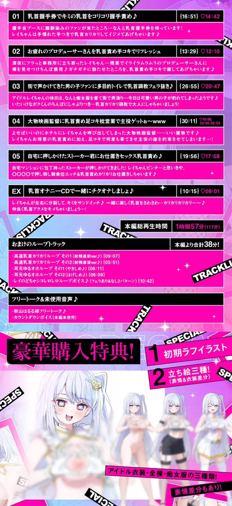 【トラックリスト&特典】レイちゃん乳首責めの犠牲者たち♪ 特典はおまけループトラックに、初期ラフ+立ち絵3種を収録!