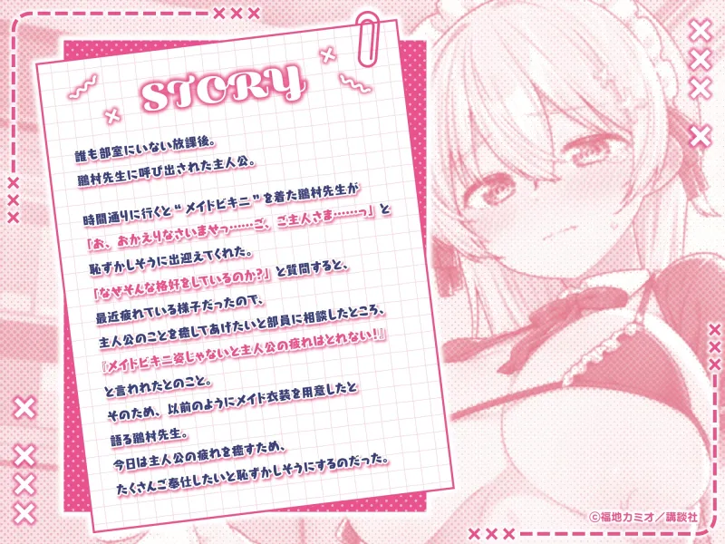 最近疲れている様子だったので、主人公のことを癒してあげたいと部員に相談したところ、『メイドビキニ姿じゃないと主人公の疲れはとれない!』と言われたとのこと。