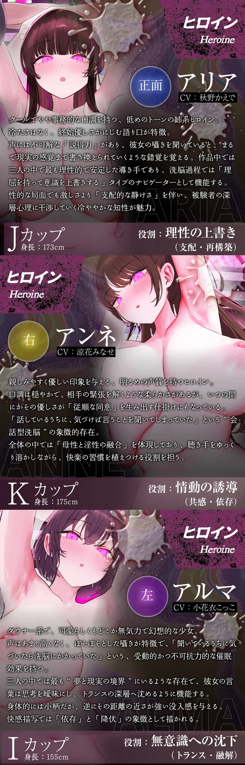 視覚を奪われたまま、聴覚だけで支配される。手の動き、呼吸、心拍が三人の声に同期していく。寸止めの苦痛が洗脳を深く刻み、焦燥が“服従”に変わる。アリアの指令、アンネの慰め、アルマの無表情な囁き──三重の責めが、あなたを理性の底から快感奴隷へと変えていく。