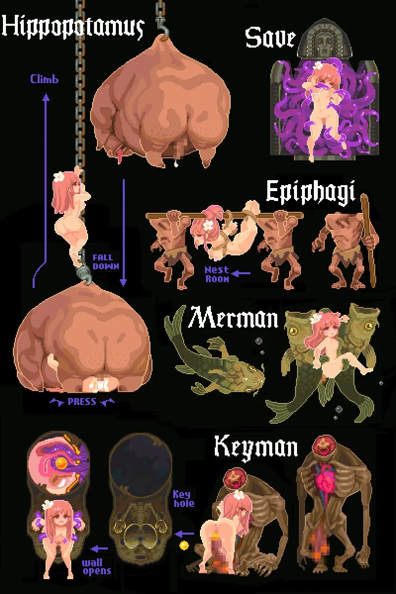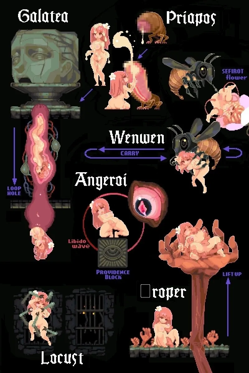 通路を塞ぐ巨大な頭の使徒。踏み台として登ることができる。尿が好物で舐め啜ろうと前進する。口の中に捉えた少女を舌でもてあそぶ間は後退する特性を持つ。精液で汚れていると口にしない。