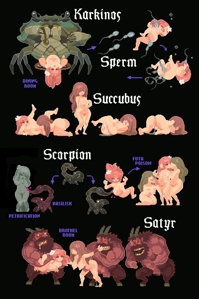 少女の体内に入ろうと穴という穴を狙う巨大な精子。スパームによって妊娠してしまうとカルキノスの食卓へと運ばれる。