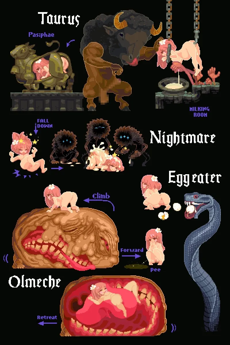道を塞ぐ半人半牛の使徒。人間の女は性の対象ではなく乳を絞るための家畜。捕まると搾乳室に運ばれ器具による種付けと乳搾りが行われる。パシパエという牝牛の銅像を利用すればタウロスを移動させることができる。