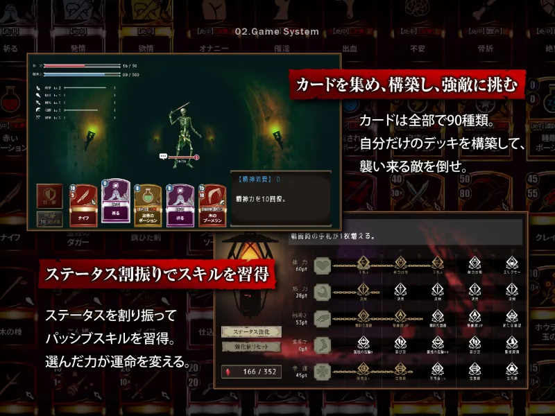 ダンジョンの暗闇には強力な敵や罠が潜んでいます。ステータスを強化して対抗しましょう。