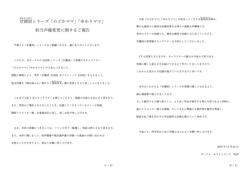 登場キャラクター「のどかママ」「ゆかりママ」担当声優変更のお知らせ
