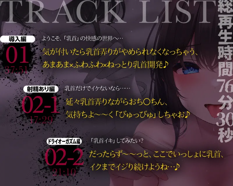 徐々に性感をリンクさせるうちに、気が付いたら「乳首だけでイケちゃう」ようになる、ひたすらねっとりあまあま&エッチなアニメーションで、「乳首開発」の世界にどっぷりハマっちゃおう!