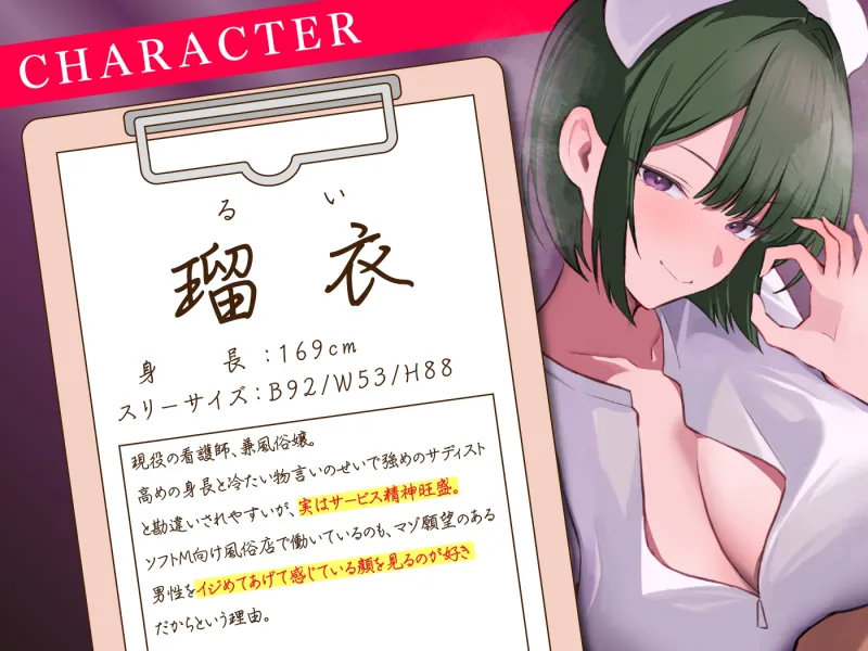 呼び出されてあなたが入った部屋には、胸元がガッツリ空いたナース服を着ている瑠衣がいた。