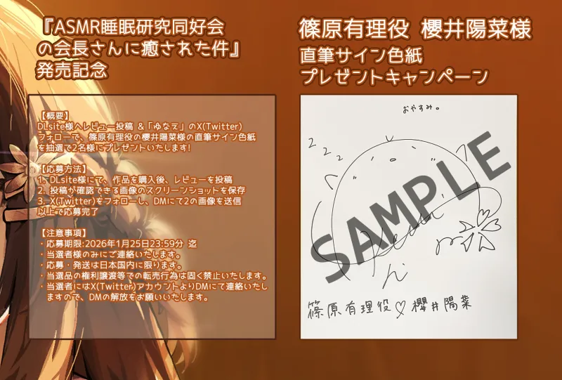 DLsite様へレビュー投稿を「ゆなえ」のX(Twitter)アカウント(x.com/Yunae_ASMR )をフォローで、篠原有理役の櫻井陽菜様の直筆サイン色紙を抽選で2名様にプレゼントいたします。