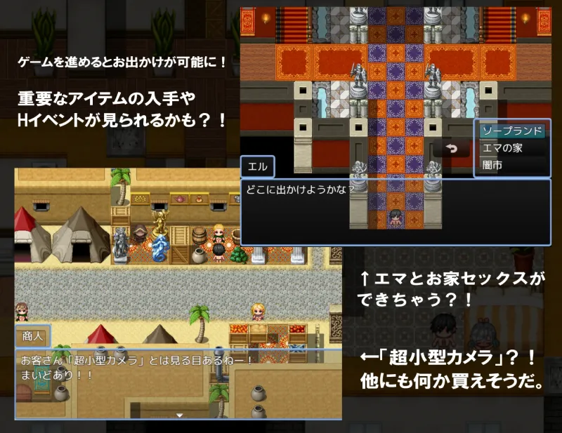 計3種類のお出かけ先を選択可能。キーアイテムの入手やエッチなイベントを見逃すな!