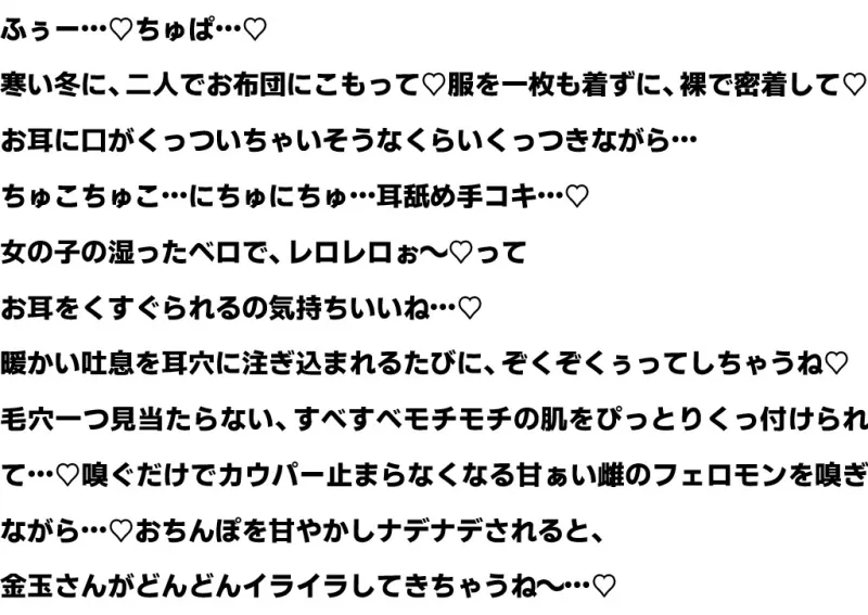 《布団の中でイチャラブ手コキ/耳元ささやきとネットリ耳舐めで精液熟成/好き好き囁き/お耳フーフー/中出しのためだけに即ハメ騎乗位/女子の生まんこをオナティッシュみたいに使って中出し》