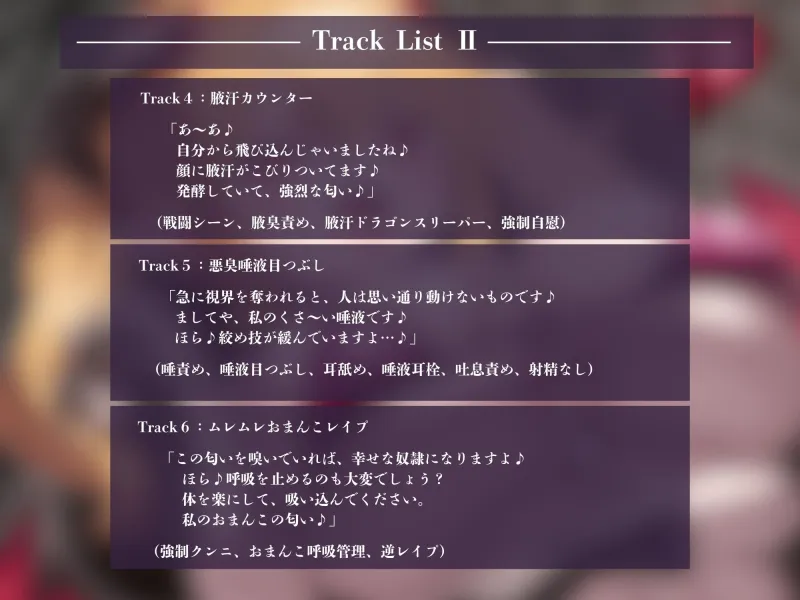 (戦闘シーン、腋臭責め、腋汗ドラゴンスリーパー、強制自慰)
