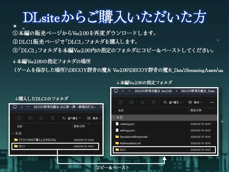 本編販売ページより【Ver.2.00】をダウンロードの上、画像の手順に沿ってDLCの導入をお願いいたします。