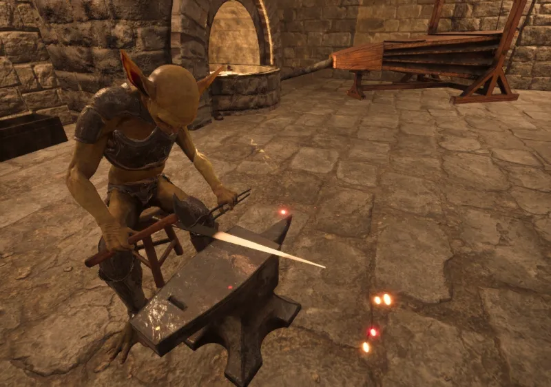 剣、盾、長剣、弓など、様々な武器が存在します。武器によって攻撃モーションやスタミナ消費、プレイスタイルが変化します。また、捕らえられた後の脱出時は、周囲にある武器を利用しなければならないため、多様なプレイが求められます。