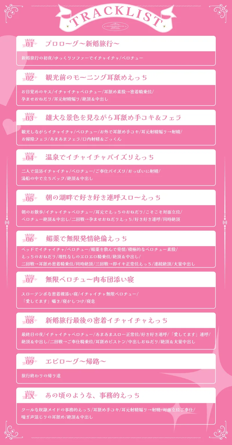 (最終日の夜/イチャイチャベロチュー/あまあまスロー正常位/好き好き連呼/「愛してます」連呼/絶頂&中出し/二回戦→ご奉仕騎乗位/耳舐めピストン/中出しおねだり/絶頂&大量中出し)