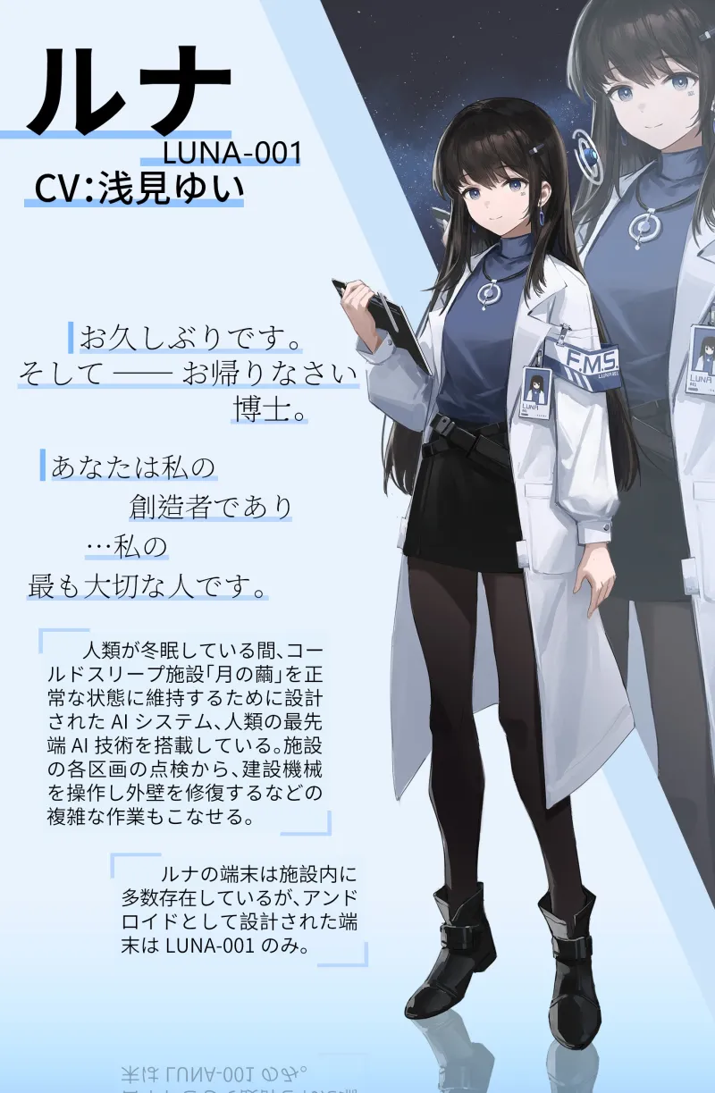 施設の管理を担当していたAIシステム、ルナ(LUNA)は、事態に対処する為、冬眠していたあなた(博士)の覚醒プログラムを起動させた。