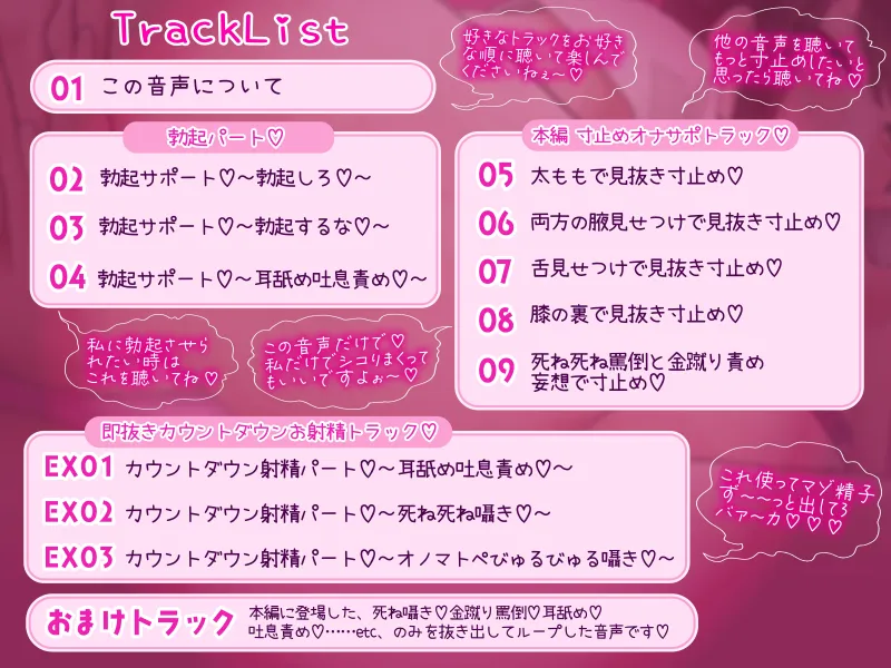 本編トラックに登場した、死ね囁き♡金蹴り罵倒♡耳舐め♡吐息責め♡……etc、のみを抜き出してループした音声です♡