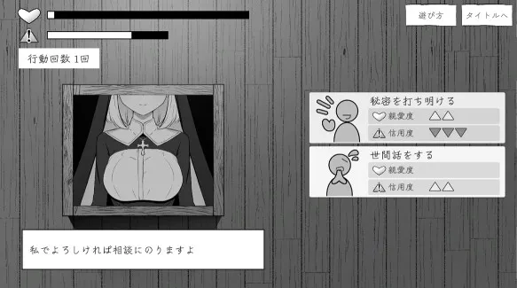 疲れた様子の主人公を見かねたシスターは、懺悔室に顔を出さないかと声をかける。